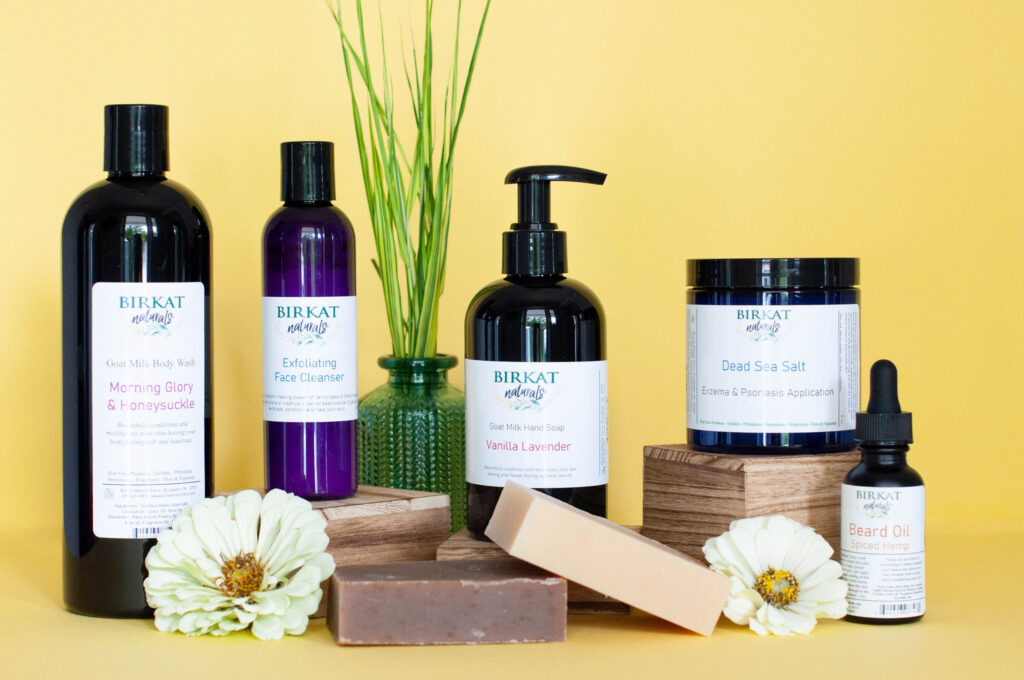 We handcraft all of our soap in small batches, and all but two of our soaps are made with goat’s milk. Our soaps include bars, liquid hand soap, and body washes. The two that do not include goat’s milk are our exfoliating facial cleanser and our liquid laundry soaps.